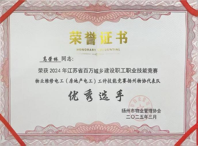 維修電工(房地產(chǎn)電工)工種技能競賽“優(yōu)秀選手 ”,高榮林同志,憑借出色的工作技能,在省級(jí)競賽“江蘇省百萬城鄉(xiāng)建設(shè)職工職業(yè)技能競賽物業(yè)維修電工(房地產(chǎn)電工)工種技能競賽”中榮獲“優(yōu)秀選手 ”稱號(hào)。這一榮譽(yù)稱號(hào),不僅是對該名員工個(gè)人能力的認(rèn)可,更是對城建物業(yè)在員工培養(yǎng)與團(tuán)隊(duì)建設(shè)方面的肯定。