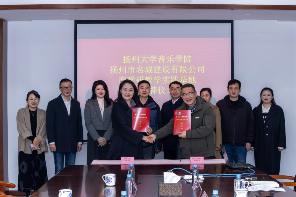 近日,揚(yáng)州市名城建設(shè)有限公司與揚(yáng)州大學(xué)音樂(lè)學(xué)院“產(chǎn)學(xué)研教學(xué)實(shí)踐基地” 簽約揭牌儀式在原古城保護(hù)展示館舉行。揚(yáng)州市名城建設(shè)有限公司黨總支書(shū)記、總經(jīng)理戴興春,揚(yáng)州大學(xué)音樂(lè)學(xué)院黨委書(shū)記陸濤、院長(zhǎng)邵萍及相關(guān)負(fù)責(zé)人出席儀式。